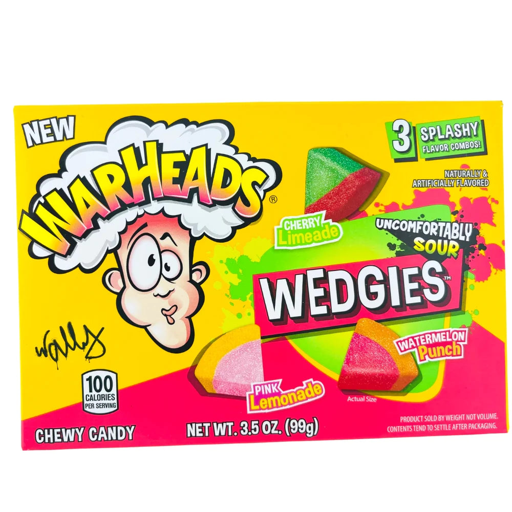 Warheads Wedgies Theater Box 3.5oz X 12 Units are a delicious and sour candy that is perfect for any occasion. These bite-sized wedges are made with a sour powder that will make your taste buds pucker. Warheads Wedgies are gluten-free and fat-free.